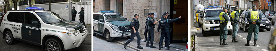 Spanyolországban három rendőri szerv működik egymás mellett, illetve egymással karöltve, de saját hatáskörökkel. Például kisebb településeken csak kicsi Guardia Civil őrsöket fogunk találni, míg a nagyobb településeken már a Policía Local és Policía Nacional együtt gondoskodik a rend védelméről. A településeken kívüli területek felügyeletét szintén a Guardia Civil látja el. A hagyományos közúti ellenőrzéseket a Policía Local és a Guardia Civil végzi (okmányok, járműbiztosítások ellenőrzése, szondáztatás: alkohol és drog ellenőrzés), míg a Policia Nacional bűnügyi szempontból végez ellenőrzéseket az utakon.